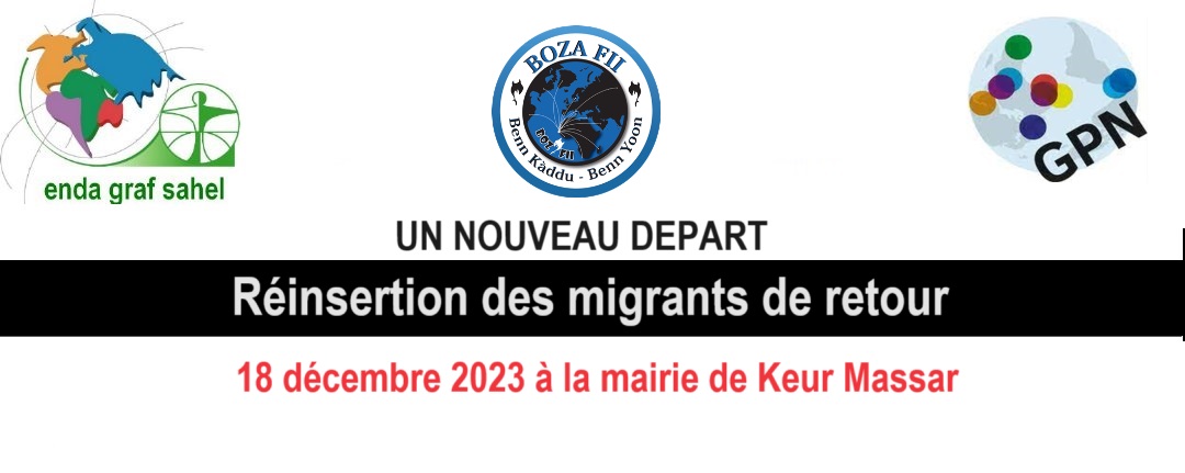 L’association Boza-fii en collaboration avec Enda Graf Sahel, a tenu un atelier GPN (GLOBAL PARTNERSHIP NETWORK) le 18 Décembre à la mairie de Keur Massar Nord. Sous le thème de : Réinsertion des migrants de retour, cet évènement était également une occasion pour Boza-fii de célébrer la journée internationale de la migration.